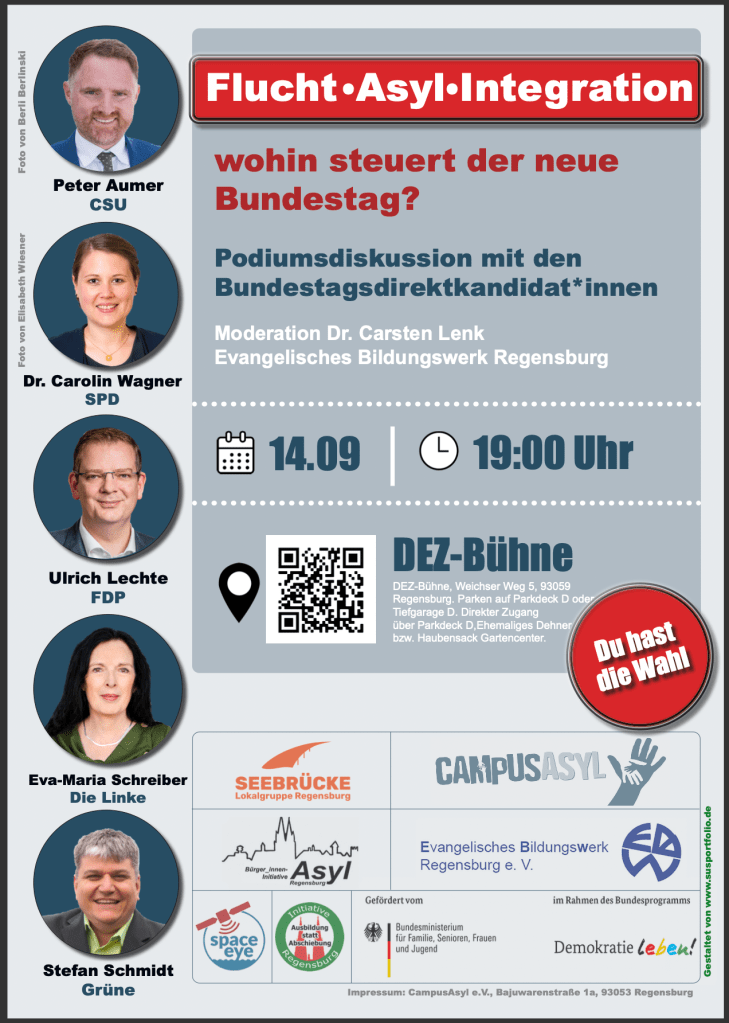 Das Poster wird im Format 297 x 420 mm gedruckt. Eine ehrenamtliche Tätigkeit für die Organisation Campus Asyl in Regensburg