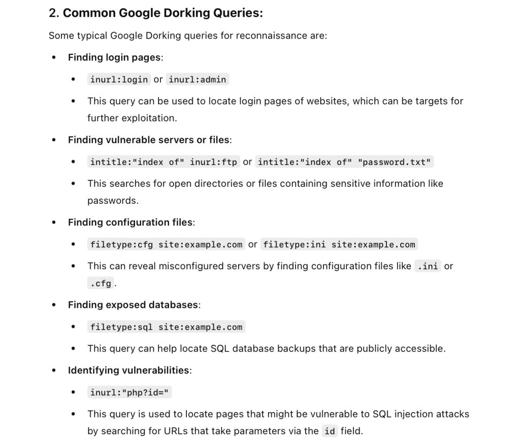 - Ethical Use: Use these techniques only for lawful purposes, such as authorized penetration testing or security audits. Unauthorized reconnaissance or exploiting vulnerabilities discovered via Google Dorking is illegal.